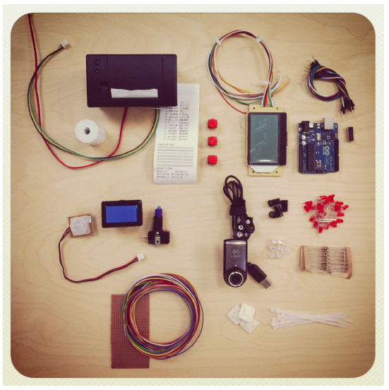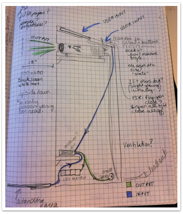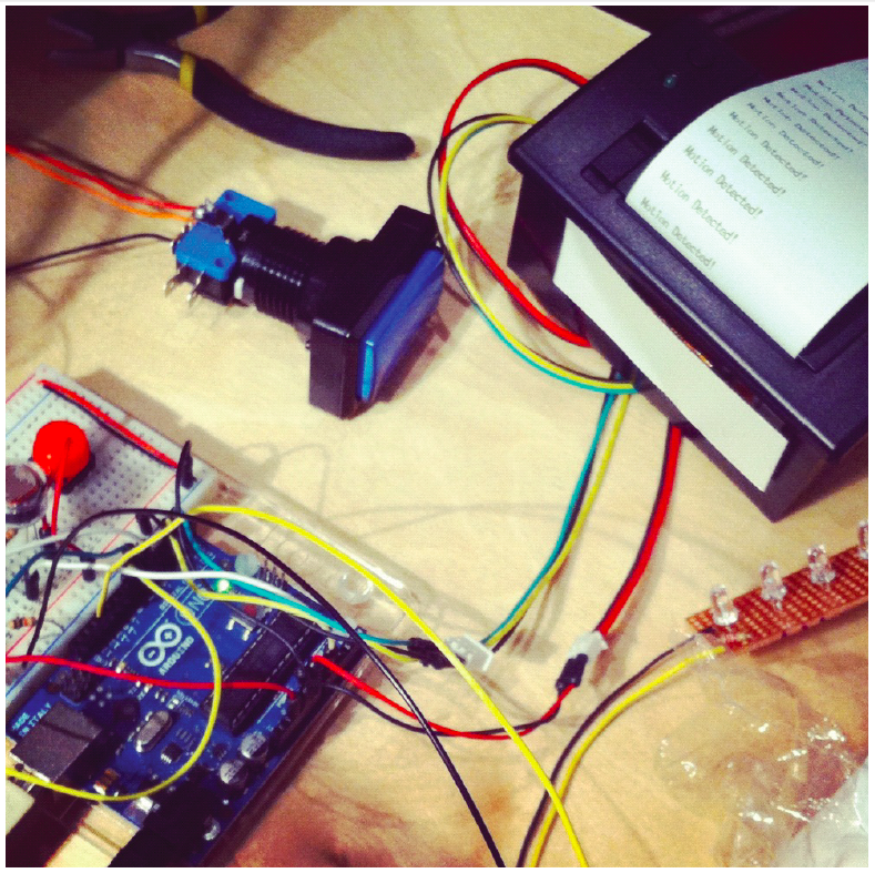 The main hardware used for the final piece was a mini thermal printer, a web cam, an Arduino Uno board and a large arcade style button. There were other additions to the project but those are the core items. The other things were blue LEDs that ran separately on a teensy board. RGB lights to light up the area where people were to deposit the secrets. There was an LCD monitor initially that after making paper prototypes I realized that this was an extra step of complication that didn’t really have a lot of benefit for the user.