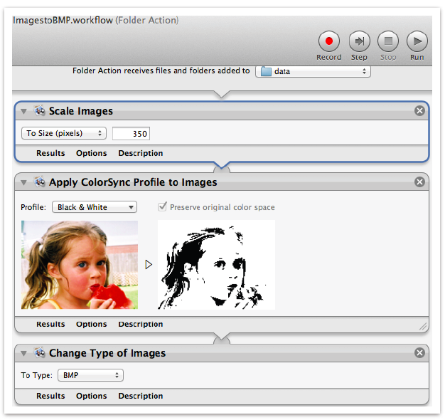 I eventually used Automator to create a workflow on the data folder where the images were being saved. My eventual workflow at this stage was scale images, to be sure they were the correct size, to applying the ColorSync profiles to make it Black & white, and finally save it as a .bmp file.