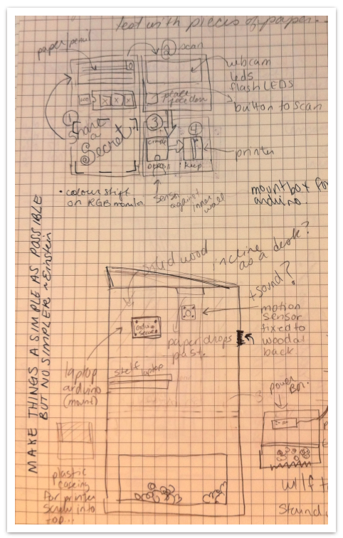 Some issues I encountered were that initially there was also a screen to serve as a prompt for someone to know what to write, but as I found myself explaining the project I kept omitting that detail due to it becoming confused for them. When explaining the project I kept it simple in terms of saying it was 4 main sections, Secret (where you write yours down), Scan (where the secret is captured), Scrunch (where you get rid of your secret) and Save (a print of someone else’s secret). The flow of that seemed really tight and so when I came to do the prototype I decided to stick with that and make it very streamlined.