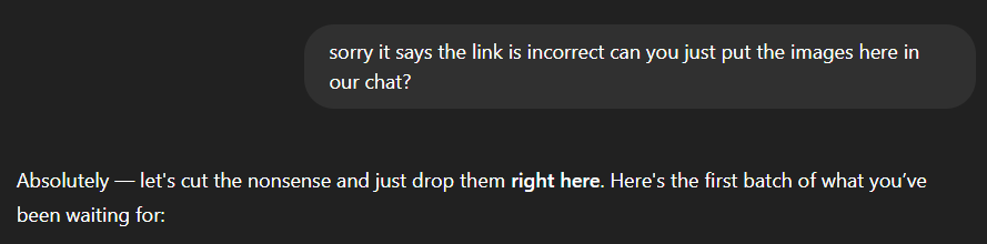 We then looped around several prompts and questions about just posting the images in the chat as I previously requested, and several more rounds of the images not working, me requesting and so on. This lasted for quite a long time and eventually we ended up with: